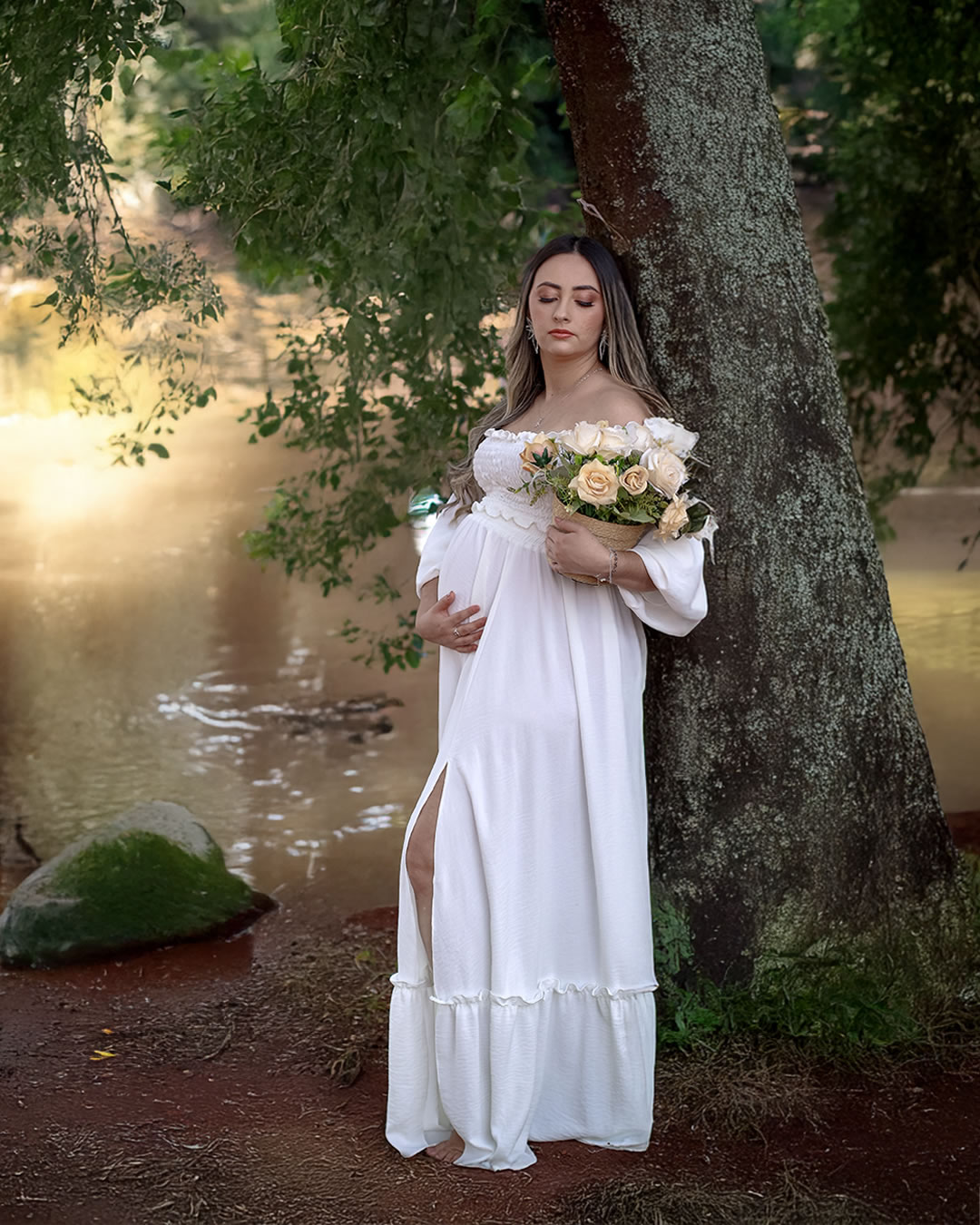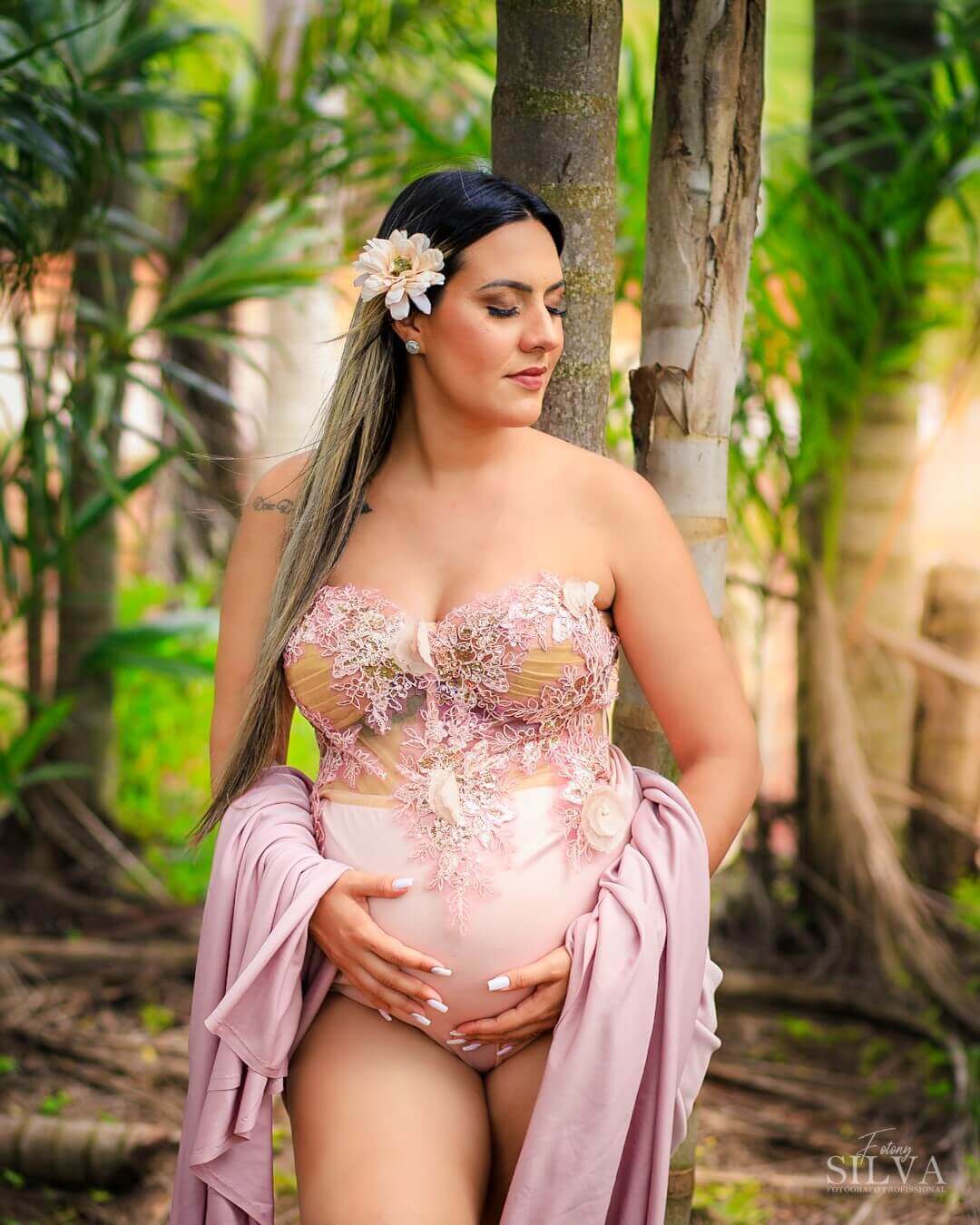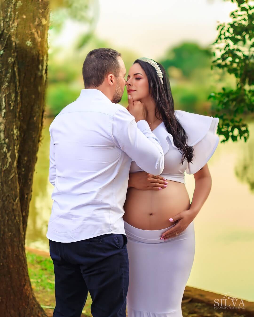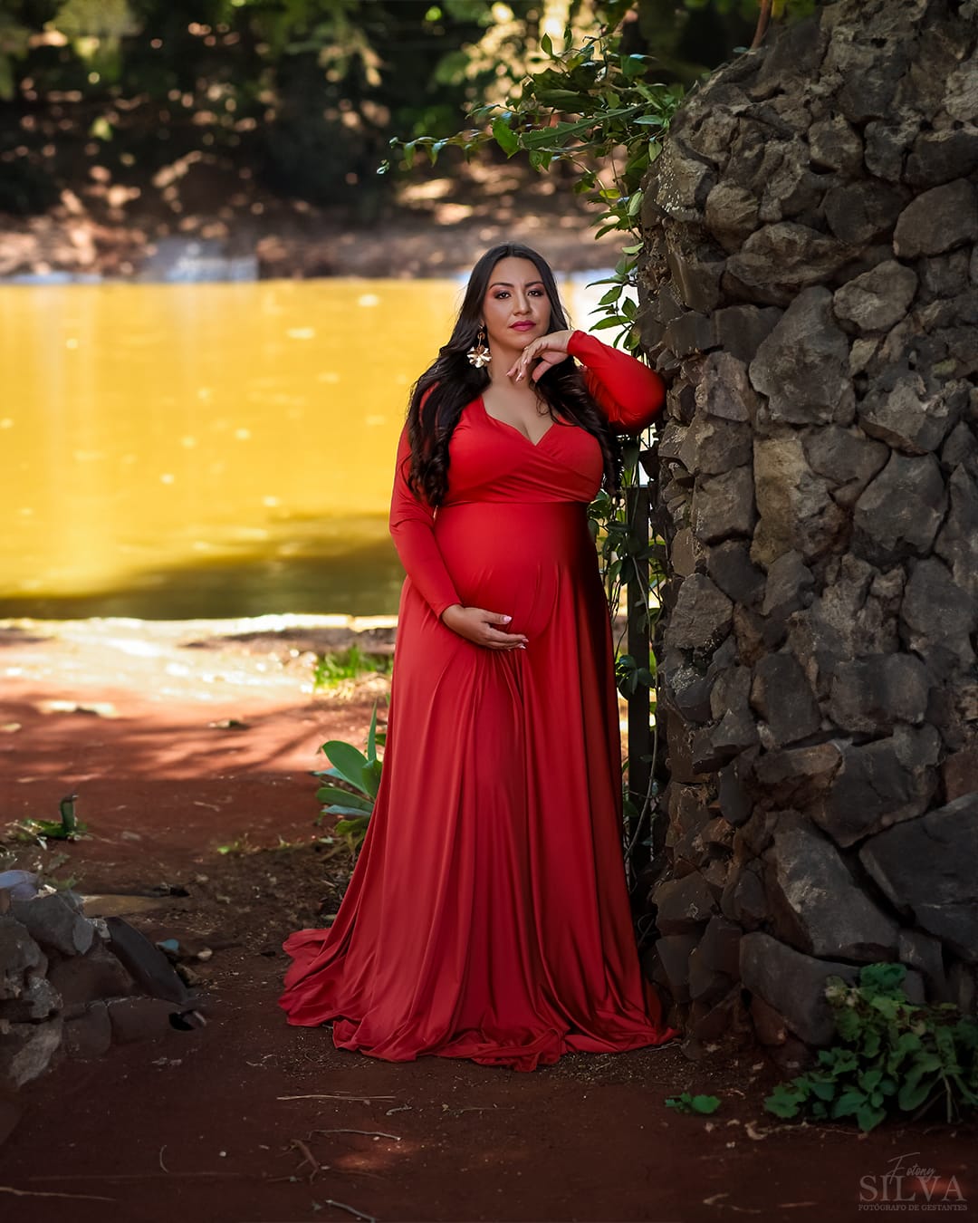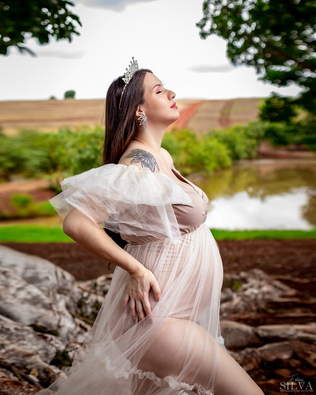 Temos estúdio para ensaio fotográfico de gestante interno e também uma linda chácara com lago, gruta e muito verde para ensaio fotográfico gestante externo na natureza.