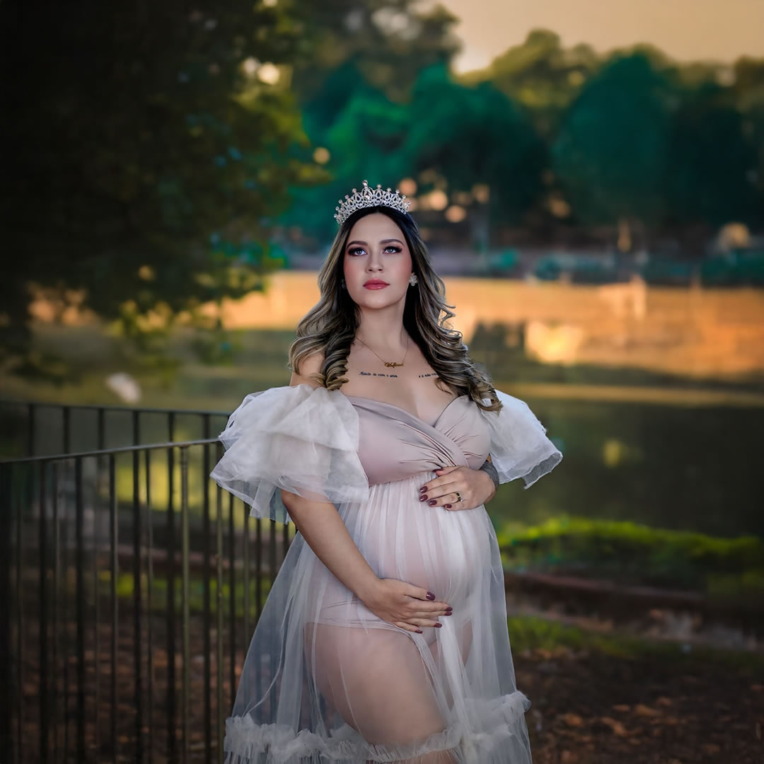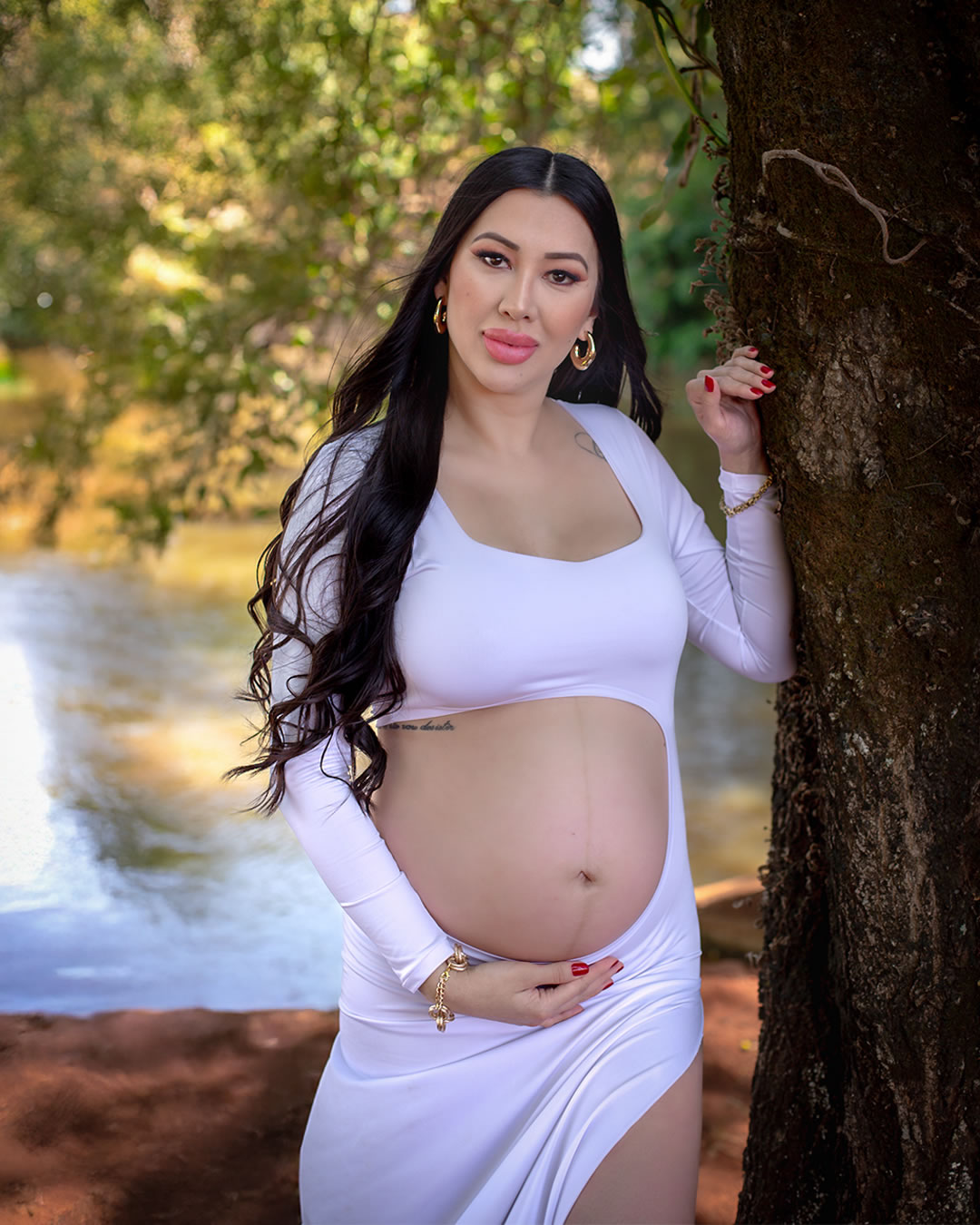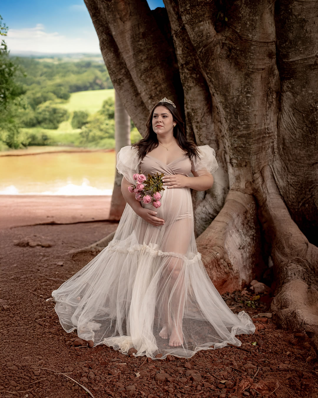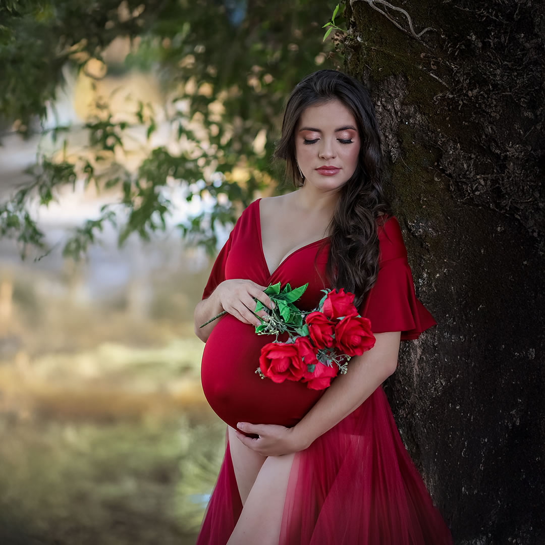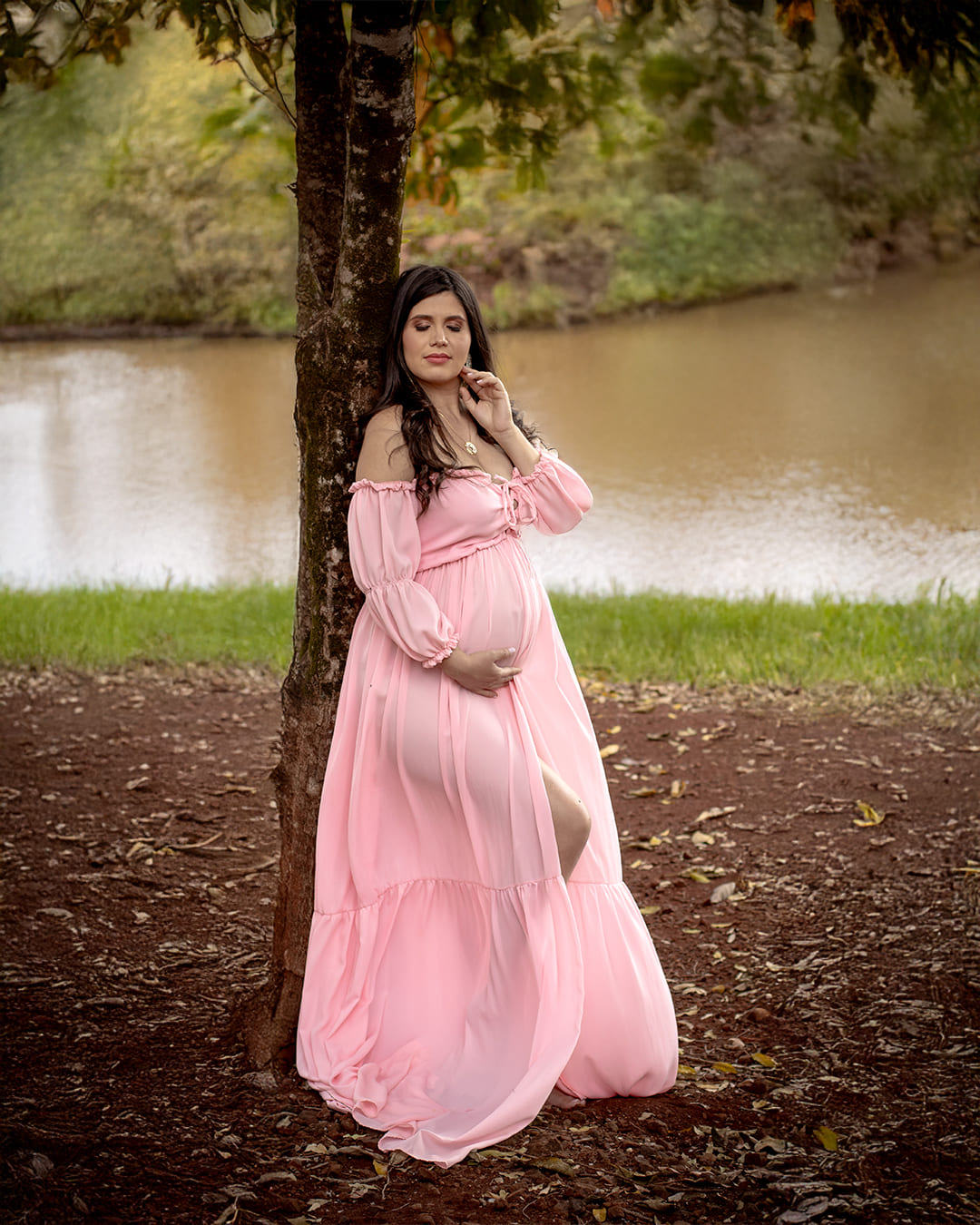 Temos estúdio para ensaio fotográfico de gestante interno e também uma linda chácara com lago, gruta e muito verde para ensaio fotográfico gestante externo na natureza.